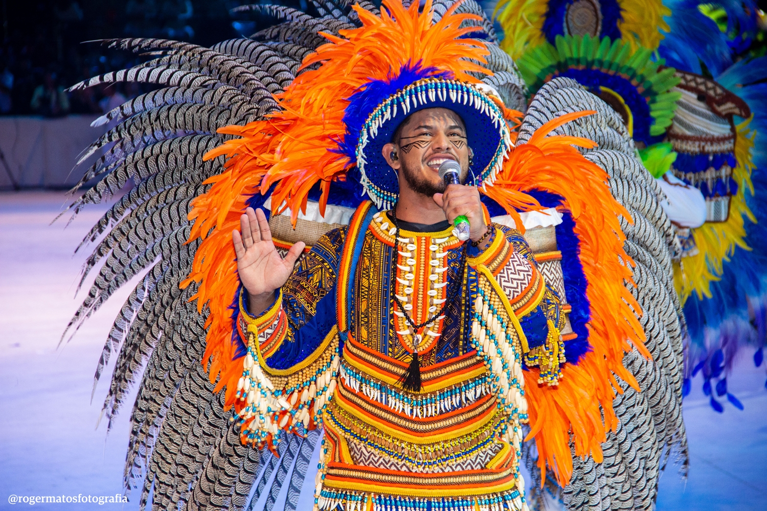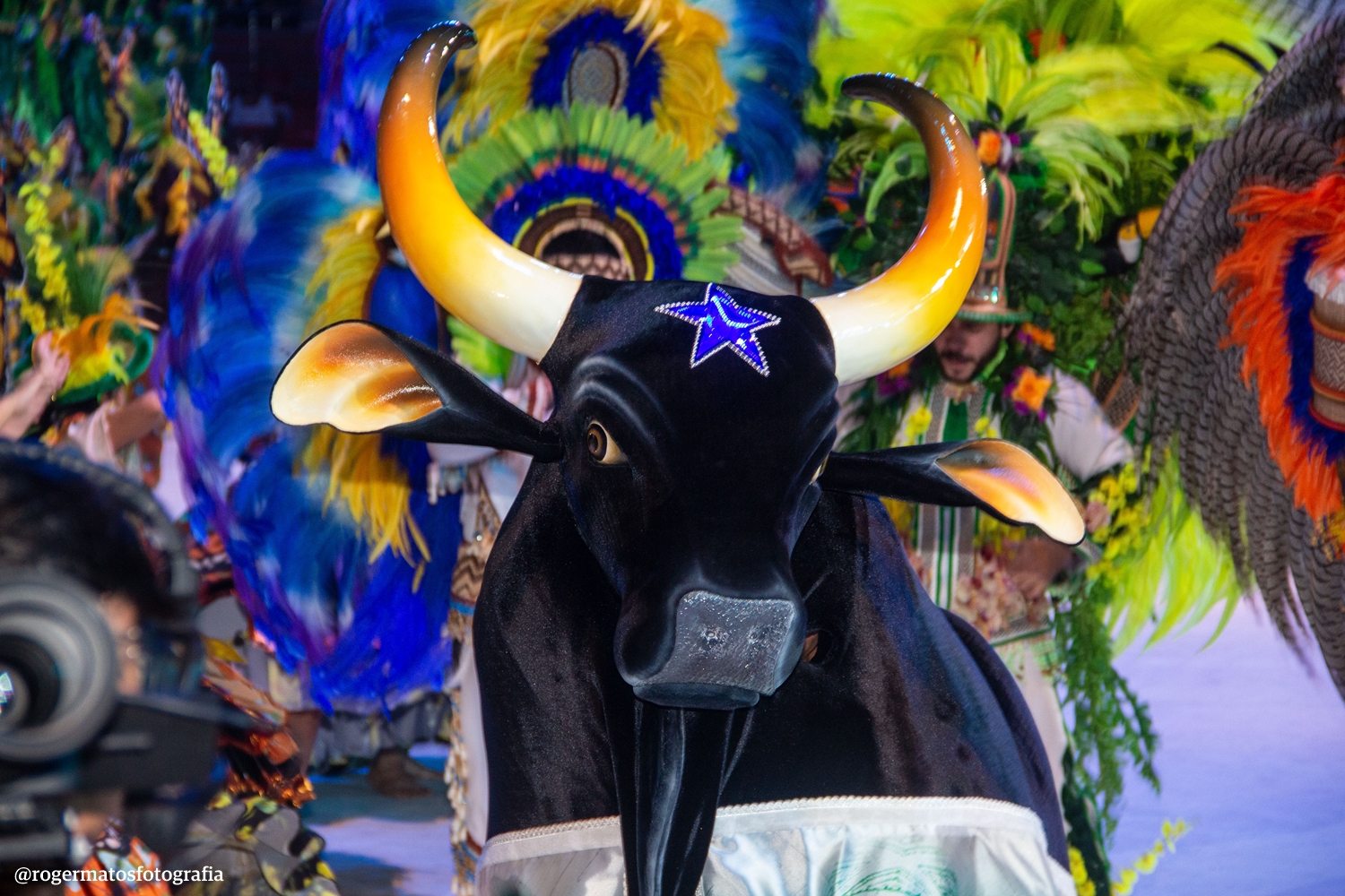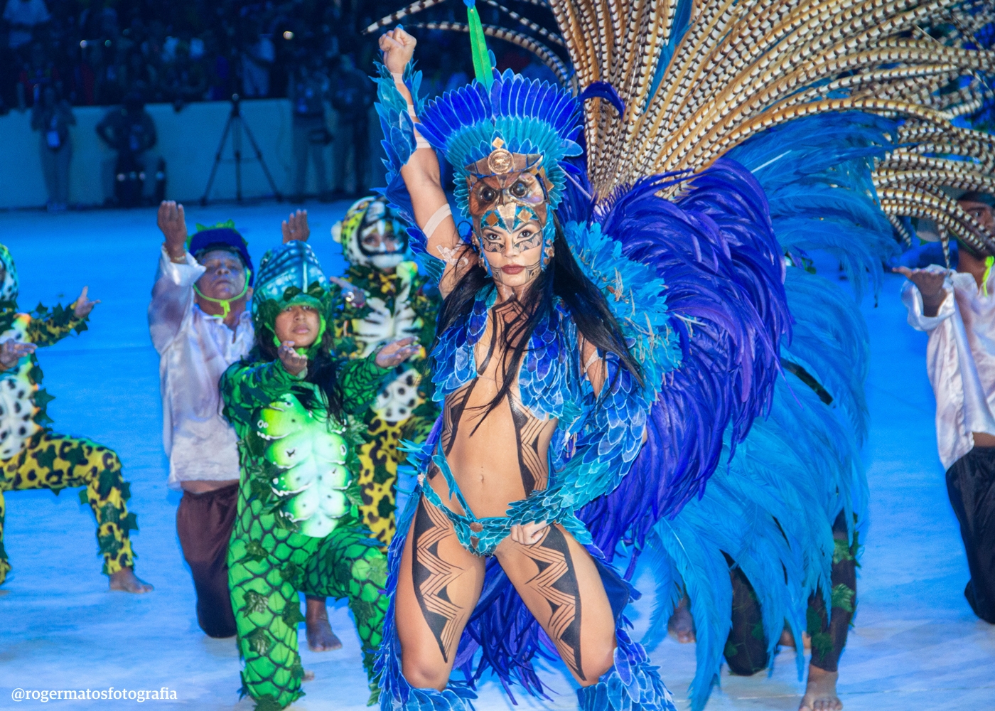 O primeiro cenário alegórico da noite apresentou a Lenda Amazônica “Waurãga e os Wauã-Kãkãnemas”. Conta o saber ancestral que Waurãga é a “mãe de todas as mães da mata”. Quando o território é violado por grileiros, madeireiros ou garimpeiros, ela desperta com olhar de fúria e envia os Kãkãnemas, espíritos da floresta que habitam os corpos dos animais para combater os invasores. A alegoria revelou a Cunhã Poranga Marciele Albuquerque.