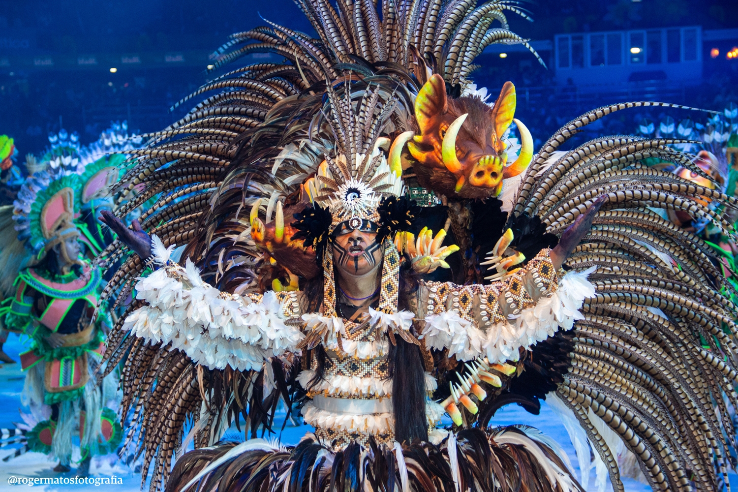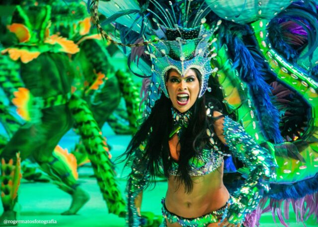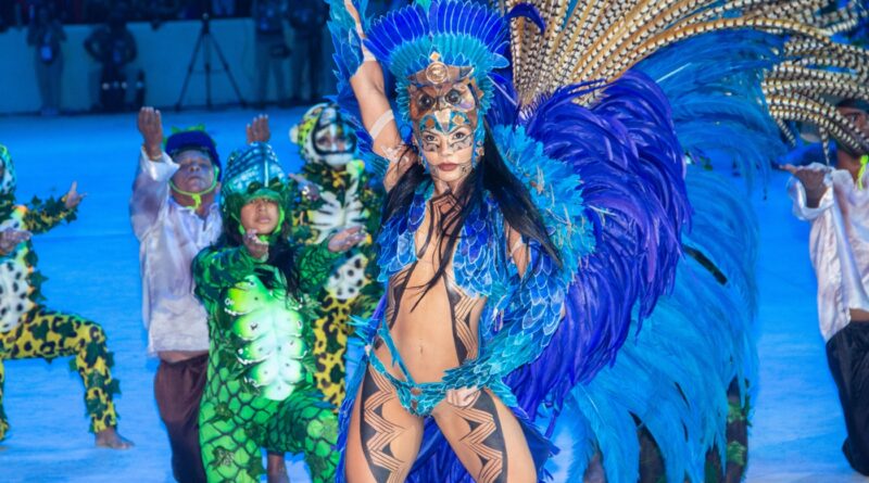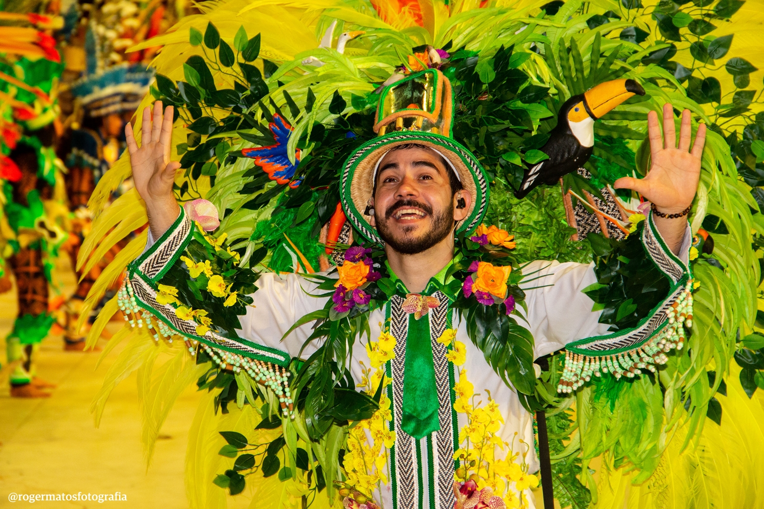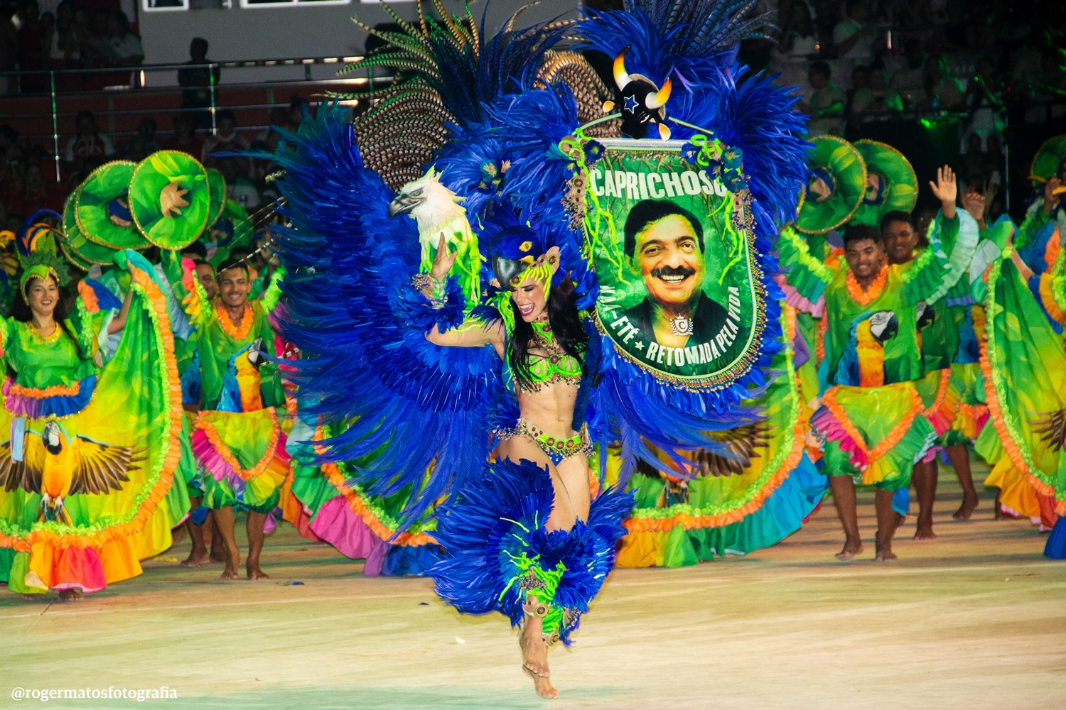 O primeiro cenário alegórico da noite apresentou a Lenda Amazônica “Waurãga e os Wauã-Kãkãnemas”. Conta o saber ancestral que Waurãga é a “mãe de todas as mães da mata”. Quando o território é violado por grileiros, madeireiros ou garimpeiros, ela desperta com olhar de fúria e envia os Kãkãnemas, espíritos da floresta que habitam os corpos dos animais para combater os invasores. A alegoria revelou a Cunhã Poranga Marciele Albuquerque.