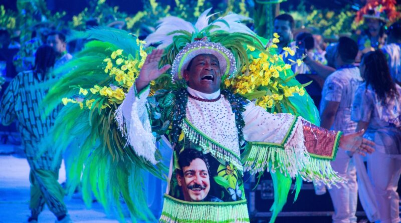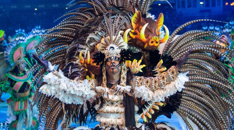 Ápice da noite, o ritual indígena Yawanawá trouxe um gigantesco cenário alegórico para contar o mariri, conjunto de cantos e danças que abre caminho para o xamã entrar em transe e buscar a cura do corpo, do espírito e da memória dos povos originários.