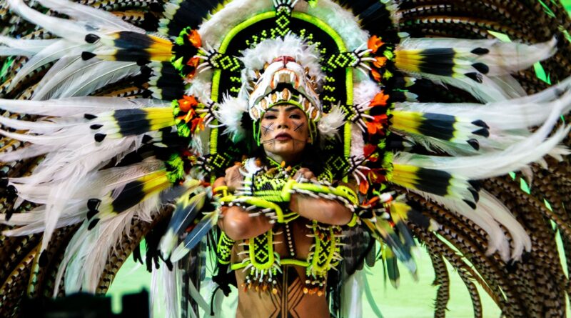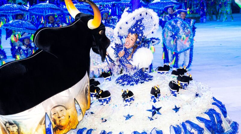 Precedido do momento indígena em coreografia da toada ‘Mothokari”, uma gigante onça de fogo trouxe à arena a Porta-Estandarte Marcela Marialva.