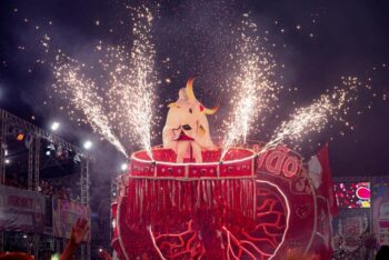 A porta-estandarte, Jeveny Mendonça, relembrou que sua estreia oficial com o item aconteceu no Carnaboi do ano passado e celebrou o retorno ao evento, destacando a emoção de viver novamente o momento nas ruas de Parintins. “Tá sendo incrível estar aqui em Parintins, novamente, no Carnailha, no Carnaboi. Que, inclusive, eu tô completando um ano, porque ano passado a minha primeira aparição com o item oficial do meu boi Garantido foi no Carnaboi”, relembrou.