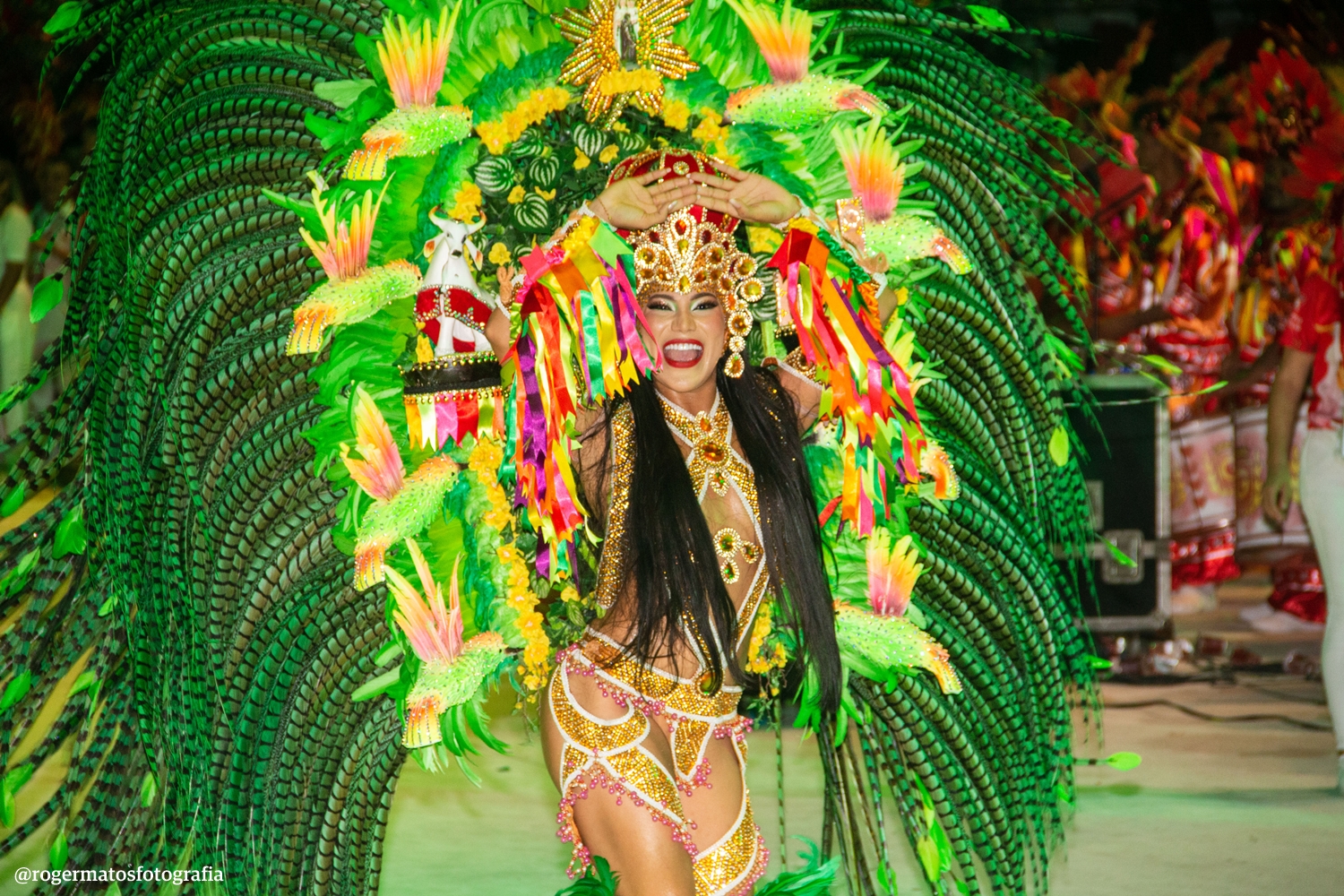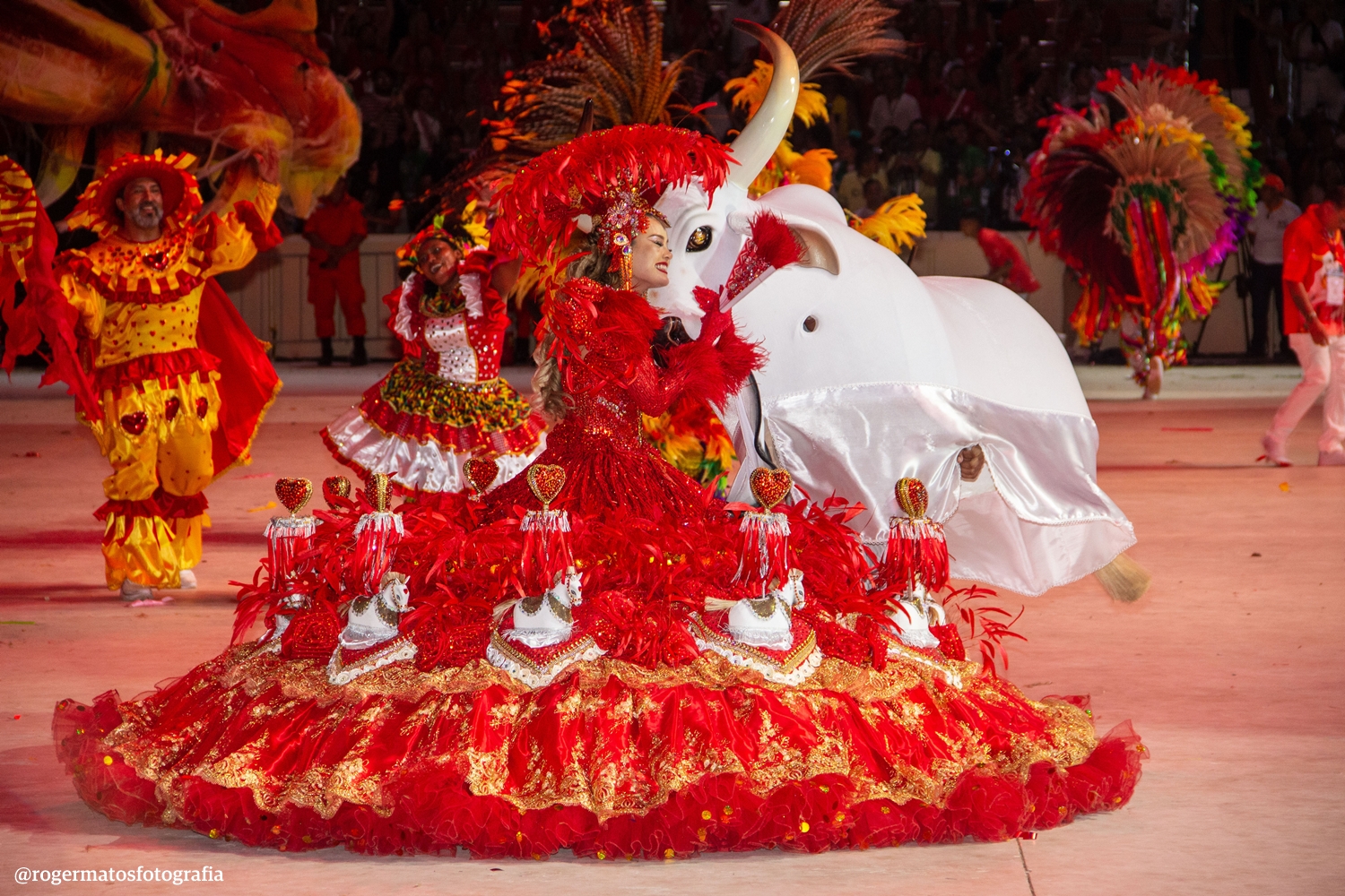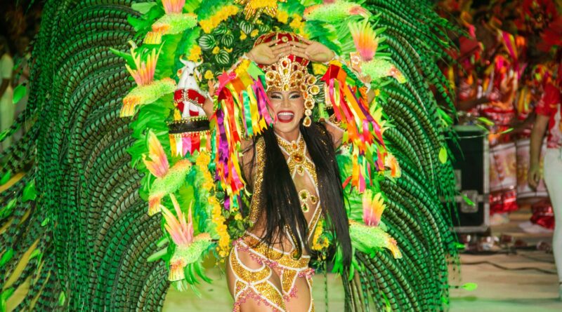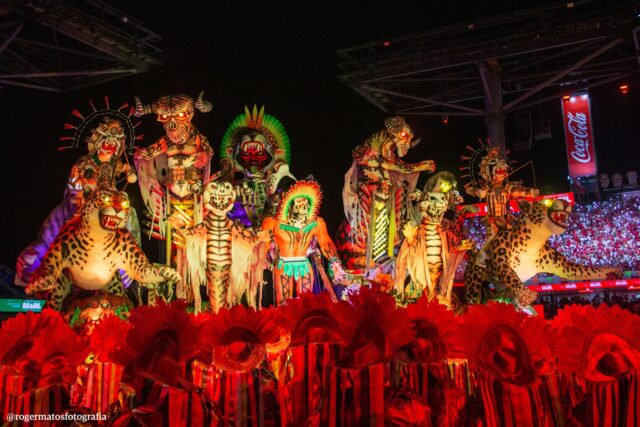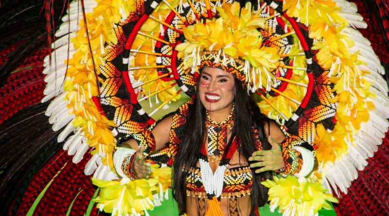 A celebração “Terra Brasileira” trouxe o Boi Garantido num coração no centro da alegoria, que também revelou a Porta-Estandarte Jeveny Mendonça e a Sinhazinha da Fazenda Valentina Coimbra.