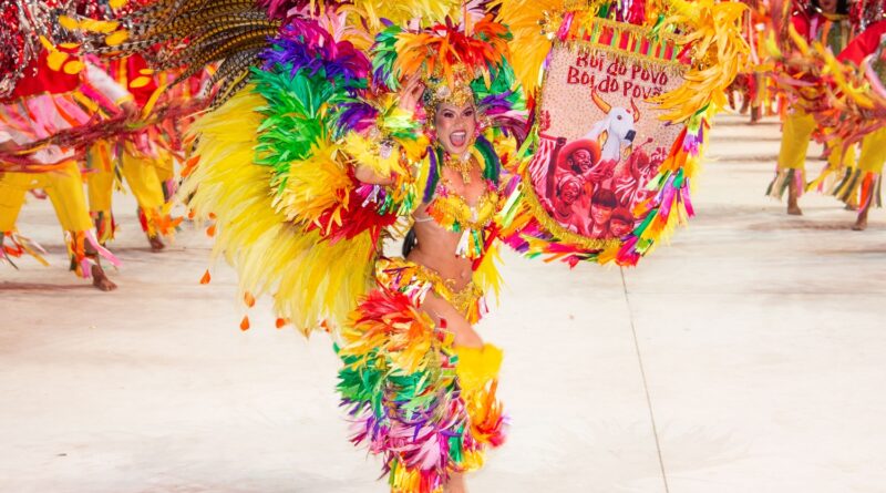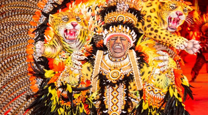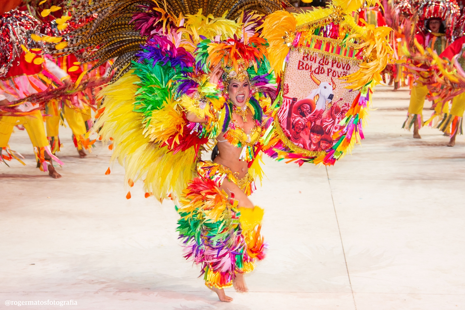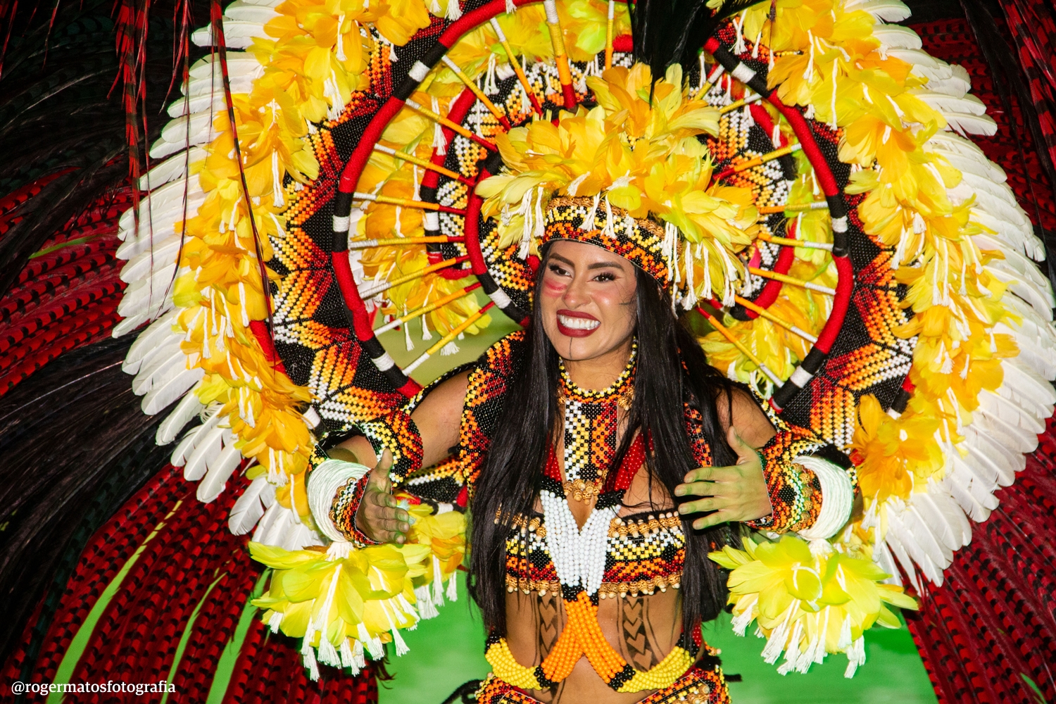A celebração “Terra Brasileira” trouxe o Boi Garantido num coração no centro da alegoria, que também revelou a Porta-Estandarte Jeveny Mendonça e a Sinhazinha da Fazenda Valentina Coimbra.