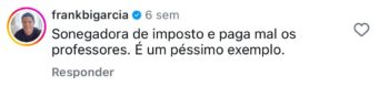 “Sonegadora de imposto e paga mal os professores. É um péssimo exemplo”, escreveu Bi Garcia na publicação. O ex-prefeito foi condenado a pagar R$ 15 mil, a título de compensação por danos morais.