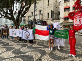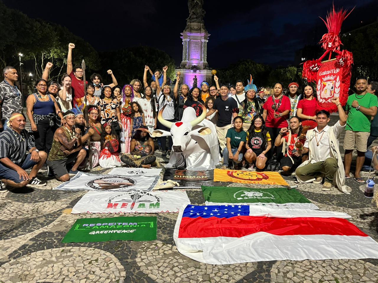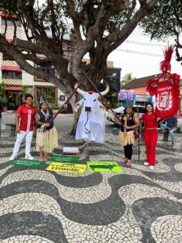 Na tarde desta terça-feira (25), o Boi-Bumbá Garantido se uniu a organizações indígenas e coletivos socioambientais do Amazonas na celebração da revogação do Decreto n° 12.600/2025 e na defesa dos rios, durante ato realizado no Largo São Sebastião, em Manaus.