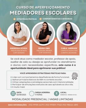 A capacitação é voltada para profissionais da área da educação e inclusão escolar e será realizada das 13h às 17h, no Workspace Morada do Sol. O curso será ministrado pela terapeuta ocupacional Carla Andrade e pelas psicólogas Andressa Uchoa e Bruna Lima.