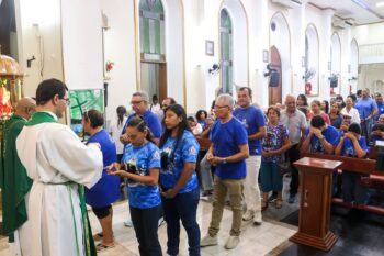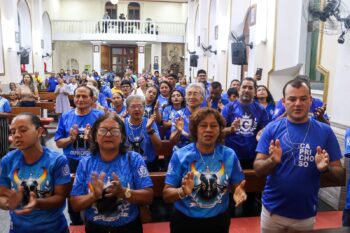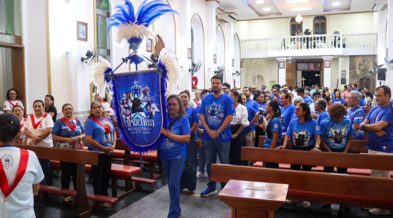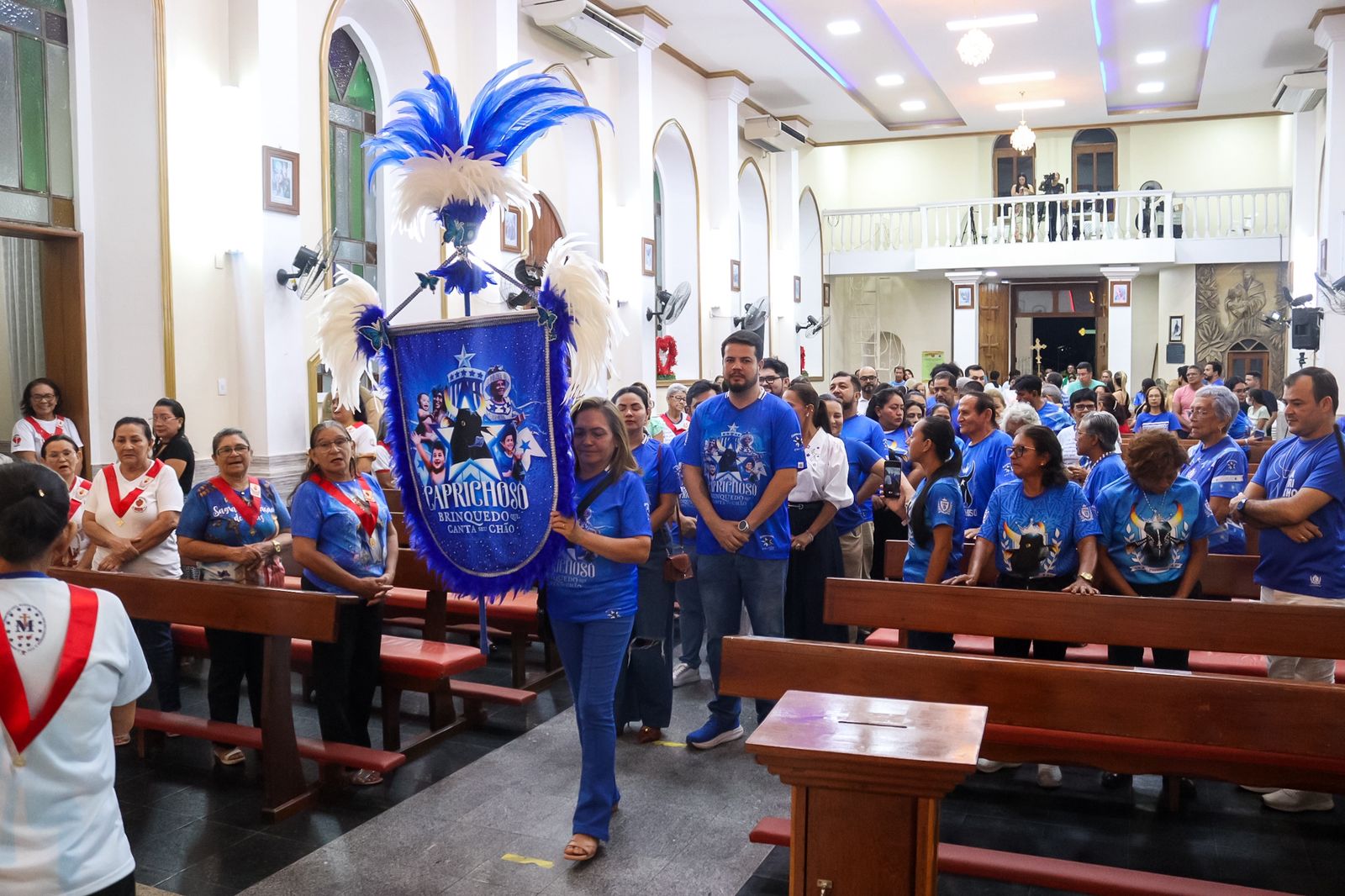 A celebração dos 112 anos do Boi Caprichoso foi marcada por uma missa em ação de graças realizada na noite desta segunda-feira (20), na Paróquia Sagrado Coração de Jesus, em Parintins. O ato religioso foi celebrado pelos padres Benedito Teixeira e Edinel Wilison Silva, reunindo diretoria, Conselho de Arte, marujeiros, Raça Azul, dançarinos, sócios e torcedores do bumbá.