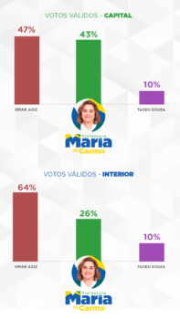A pesquisa mostra um cenário estimulado com três opções de possíveis candidatos ao Governo do Amazonas em 2026. A Professora Maria do Carmo, mesmo sem nunca ter mandato e enfrentando a máquina pública, já aparece em segundo lugar, com 43% das intenções de votos válidos na capital e 26% no interior do Estado.