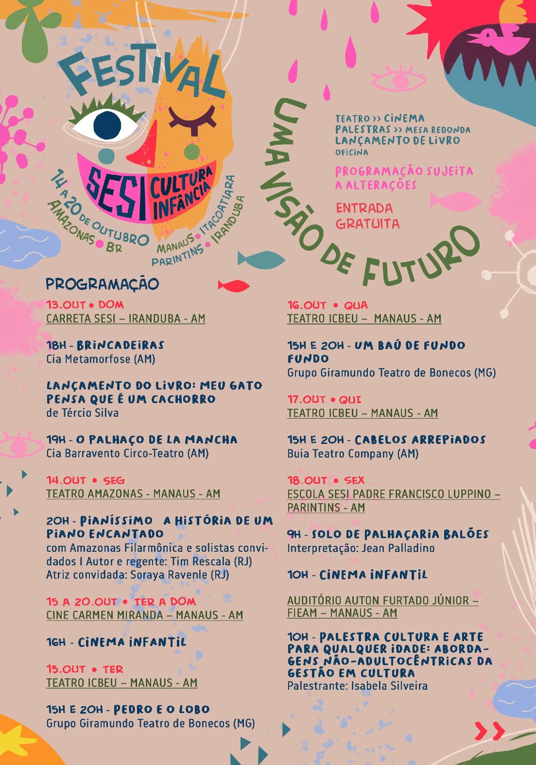 O Festival SESI Cultura Infância segue ao longo da semana com atividades para crianças e jovens, reforçando o compromisso do SESI com o acesso à cultura e à educação de qualidade. A programação completa está disponível no endereço do Instagram @festivalsesiculturainfancia ou nas redes sociais do SESI Amazonas.