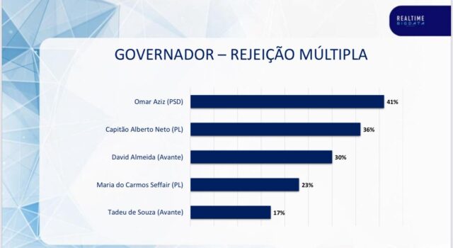 A pesquisa também levantou outros possíveis nomes para a disputa ao governo, como do deputado federal Capitão Alberto Neto (PL), que aparece com 36% de rejeição; o atual prefeito de Manaus, David Almeida (Avante), com 30%; e o vice-governador Tadeu de Souza, com 17% de rejeição.