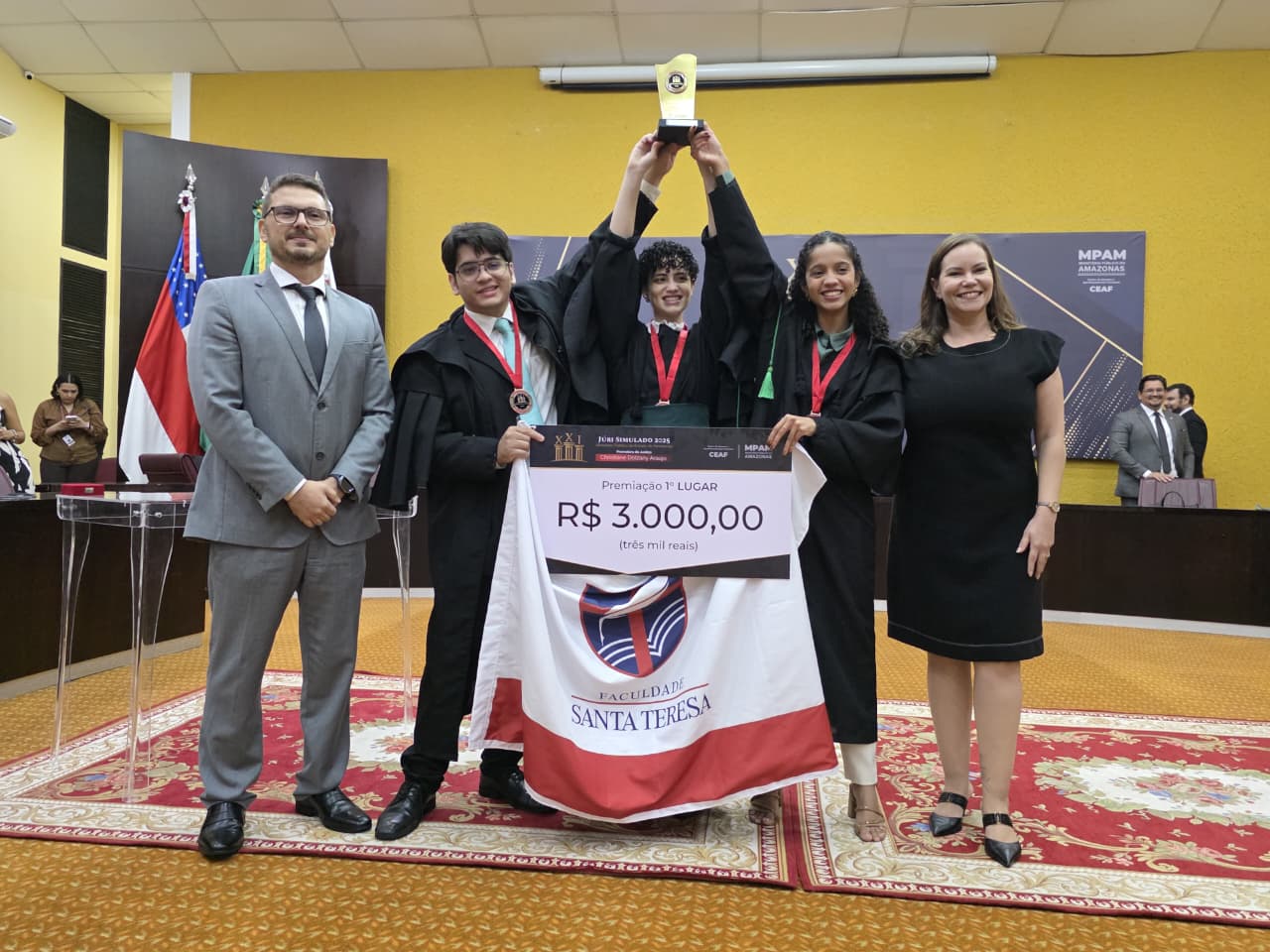 A Faculdade Santa Teresa é bicampeã do Júri Simulado do Ministério Público do Amazonas (MPAM). O time, formado por Jackeline Veloso, Eduarda Gonçalves e Lucas Soares, superou a Universidade Federal do Amazonas (Ufam) na final disputada entre a tarde e o início da noite desta sexta-feira (29/08), no auditório Carlos Alberto Bandeira de Araújo, na sede da Procuradoria-Geral de Justiça.
