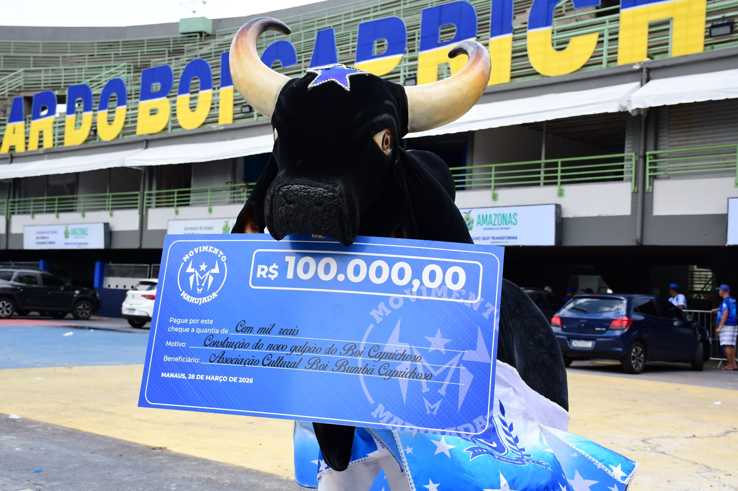 O Movimento Marujada reafirmou, mais uma vez, seu compromisso com o Boi-Bumbá Caprichoso ao realizar a doação de R$ 100 mil para contribuir com a construção do novo galpão de alegorias, em Parintins. A entrega do cheque simbólico foi feita na manhã deste sábado (28/03), no Sambódromo de Manaus, diretamente ao presidente do boi, Rossy Amoedo.